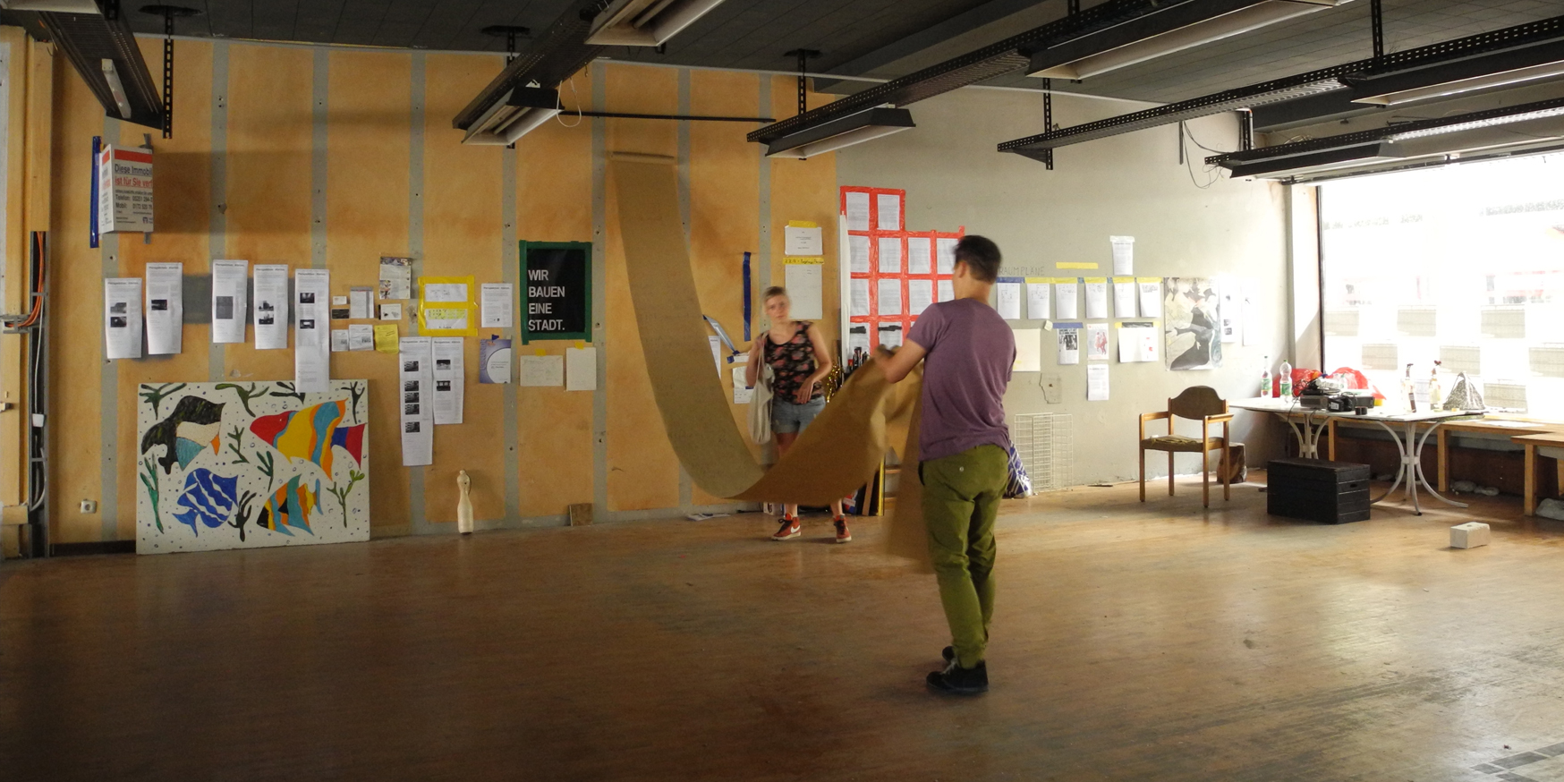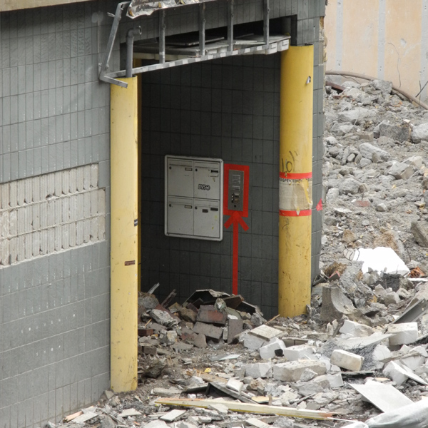 Neben der Organisation des Projekts gemeinsam mit Miriam Schröder (s. Kuratorische Tätigkeit), die ich als kommunikativen Prozess an der Grenze zum Künstlerischen verstehe, habe ich auch praktisch im Haus der Offenen Tür gearbeitet: Fragestellung aller meiner Interventionen waren die Möglichkeiten, die ein Ort noch hat, wenn er beseitigt werden soll, und jene, die er erst dadurch erhält. Als erste Geste zu Beginn des Projekts ist die Gleichsetzung von Innen- und Außenraum mit der Performance Haus der Offenen Fenster gleichzeitig als Aufmerksamkeits-Generator als auch als Prophezeiung zu verstehen. Diese Spannung wurde durch das Freilichtmuseum Marienstaße noch verstärkt: Auf dem Dach des Gebäudes, inmitten des öffentlichen Raums der Innenstadt, wurden Skulpturen ausgestellt, die aus Sicherheitsgründen niemand betrachten konnte und die gemeinsam mit dem Gebäude dem Abrissbagger zum Opfer fielen. Übrig geblieben sind nur Erinnerungen und einige Spuren, die ich in den Dia-Reihen Im Moment ist es August und Window-Color dokumentiert habe. Alle Projekte sind auf dem Blog und in der Zeitung der Perspektive: Abriss. nachzulesen. [Blog] [Zeitung]